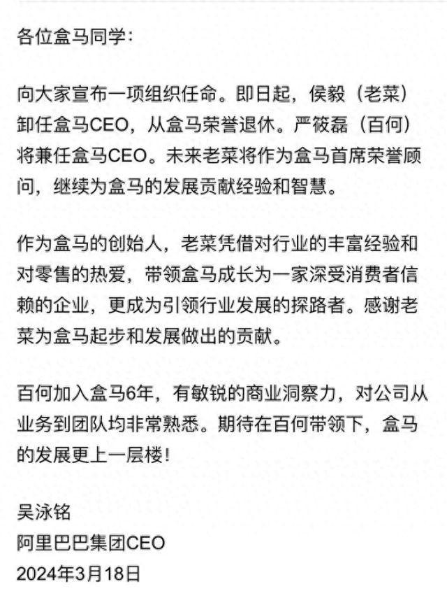 2024年3月,阿里突然宣布盒马CEO侯毅退休,作为零售行业的老兵,侯毅可以说是驰骋中国零售江湖三十年。但就在大家以为他会带领盒马上市敲钟的时刻,他却突然离开1号位的位置。这对盒马员工和阿里来说都是“相当突然的消息”。
