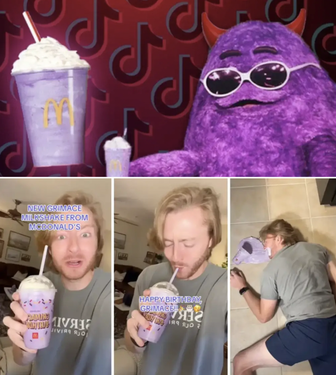 没错,麦当劳奶昔也有自己的专属IP,江湖人称“奶昔大哥”。它的原始设定是一个全身紫色的奶昔中毒者,甚至为了偷奶昔而进化出4只手。2023年,它凭借着自己的邪典形象,在外网再次掀起一阵“杀人奶昔”的创作风潮:视频里,只要有人一边喝奶昔一边说出“祝奶昔大哥生日快乐”,下一秒必定“遭遇不幸”,相关TikTok播放量高达23亿次。