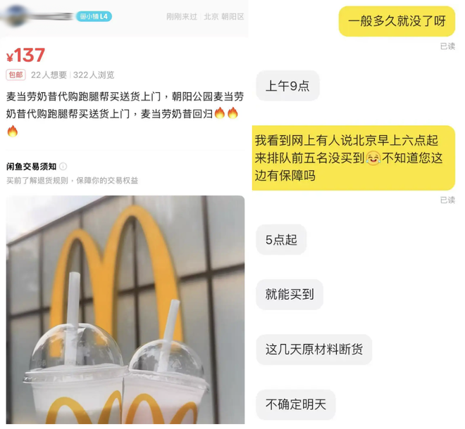 麦当劳奶昔限时回归被炒到137元/杯还得配货,打工人早上6点排队都喝不上“童年白月光”?