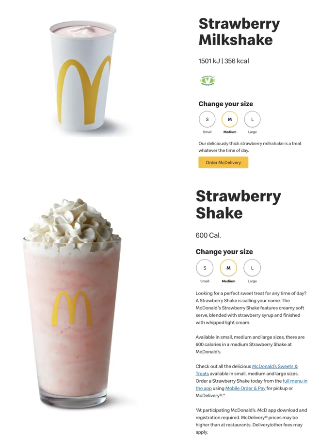 如今,在麦当劳英文官网进行检索时,会发现同时存在两种产品:一款是“奶昔(milkshake)”,一款是“没奶的昔(shake)”。同样是中杯,前者所标注的官方热量却远远高于后者。