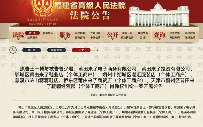 近日,福建省高院公告显示,王一博起诉莆田来了电子商务有限公司、莆田来了投资有限公司及关联鞋业店等,案件涉及肖像权纠纷,预计9月2日在莆田市荔城区人民法院开庭。去年7月,被告品牌自称与王一博有合作关系,经媒体求证,王一博方面明确否认,并称“绝对侵权”。