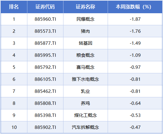 本周排在跌幅榜前排的概念板块分别是民爆概念、猪肉、转基因、粮食概念、赛马概念,累计跌幅分别为1.87%、1.76%、1.49%、1.09%、0.97%。