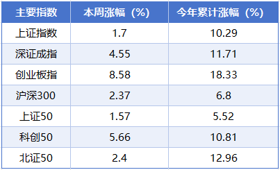指数层面,本周A股主要指数均实现大幅上涨。其中,创业板以8.58%的涨幅“遥遥领先”,紧随其后的是科创50和深证成指,本周涨幅分别为5.66%、4.55%。伴随着本周的大涨,创业板指今年以来累计涨幅达到18.33%,领跑A股市场各大指数。