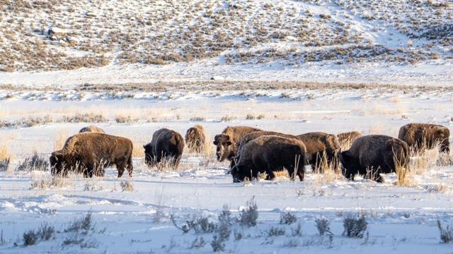 研究人员发现,冬季野牛即使被雪冻住,也会继续寻找草。图片来源:汉娜·霍夫