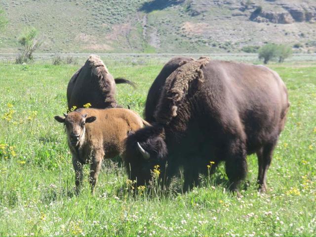 夏季,一群野牛在黄石国家公园的草地上吃着花草。图片来源:汉娜·霍夫。