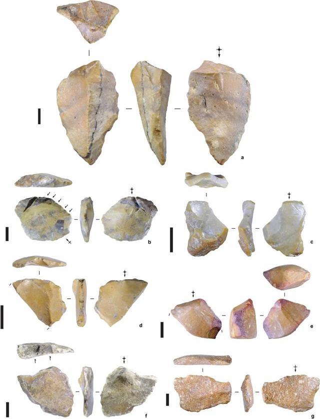 在苏拉威西岛卡利奥出土的石器,年代可追溯至104万年前。比例尺为10毫米。图片来源:MW Moore/新英格兰大学