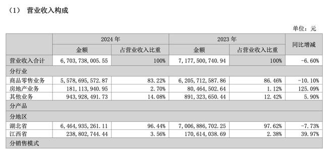 财报显示,2024年,武商集团实现营收67.04亿元,同比下滑6.60%;净利润2.16亿元,同比增长3.31%。其中,武商集团商品零售业务在2024年实现营收55.79亿元,同比下滑10.10%。