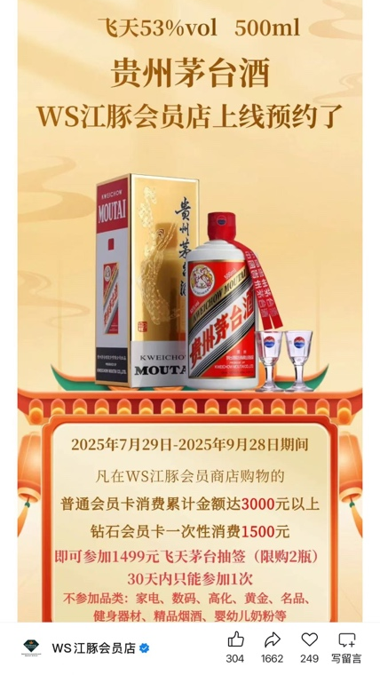 根据官方规定,凡在WS江豚会员商店购物的会员,普通会员卡消费累计金额达3000元以上、钻石会员卡一次性消费1500元,即可参加1499元飞天茅台抽签(限购2瓶),30天内只能参加1次。