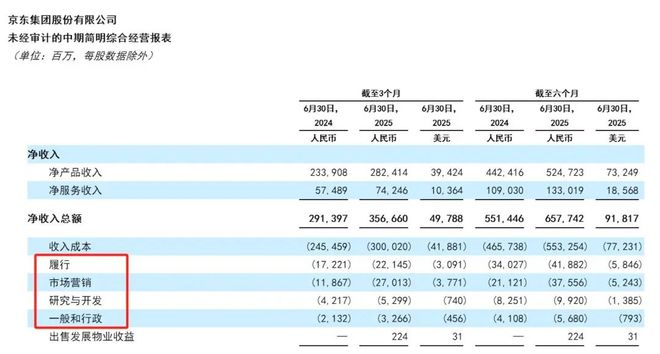 虽然京东的净利润同比大幅度下滑,但净利润受到短期投入的影响:二季度,京东市场营销支出为270亿元,同比增长127.6%,主要由于新业务推广投入加大。履约开支221亿元,同比增加28.6%,这部分主要包括采购、仓储、配送、客户服务及支付处理开支。研发开支53亿元,同比增加25.7%。