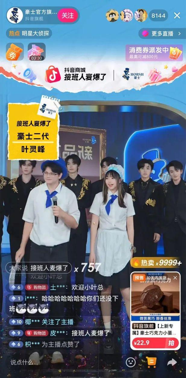前段时间,豪士二代叶灵峰就一改过往“老实人”形象,在抖音直播间亲自开团播大跳扫腿舞。看到这位创二代在直播间笨拙又卖力地舞蹈,#当老实人误闯团播赛道 等话题迅速升温,为豪士直播间带来极高热度。