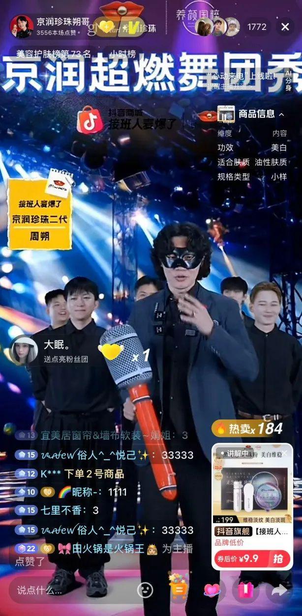在京润珍珠直播中,京润珍珠二代周硕同样在直播中设计了京润超燃舞团秀、总裁拍卖、看图猜猜猜、灵魂宵夜时刻四大创新环节,将卖货巧妙穿插在各个环节之中。