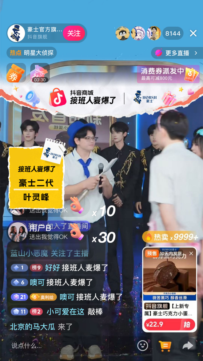 在豪士直播间,豪士二代叶灵峰则策划了“超燃团播”活动,不仅用团播突破传统食品直播间以产品展示为主的模式,高效和年轻用户完成心智连接,还用泡泡玛特labubu作为福袋,进一步吸引年轻人,有效刺激销售转化,实现GMV爆发了15倍,粉丝量在7天内上涨了70.1%。