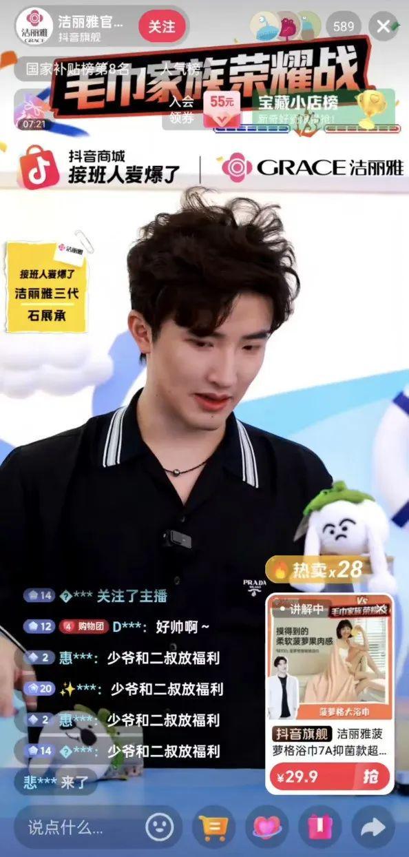 在洁丽雅的一场直播活动中,“毛巾少爷”石展承就拉上“毛巾二叔”石晶亮相,展开一场别开生面的“毛巾家族荣誉战”。他们通过结合带货与游戏的方式,在轻松的环境下带出产品优势,石展承还戴上石晶的面具跳起扫腿舞,通过极具反差感的表演引发观众热议,让品牌形象更鲜活、更易接近。