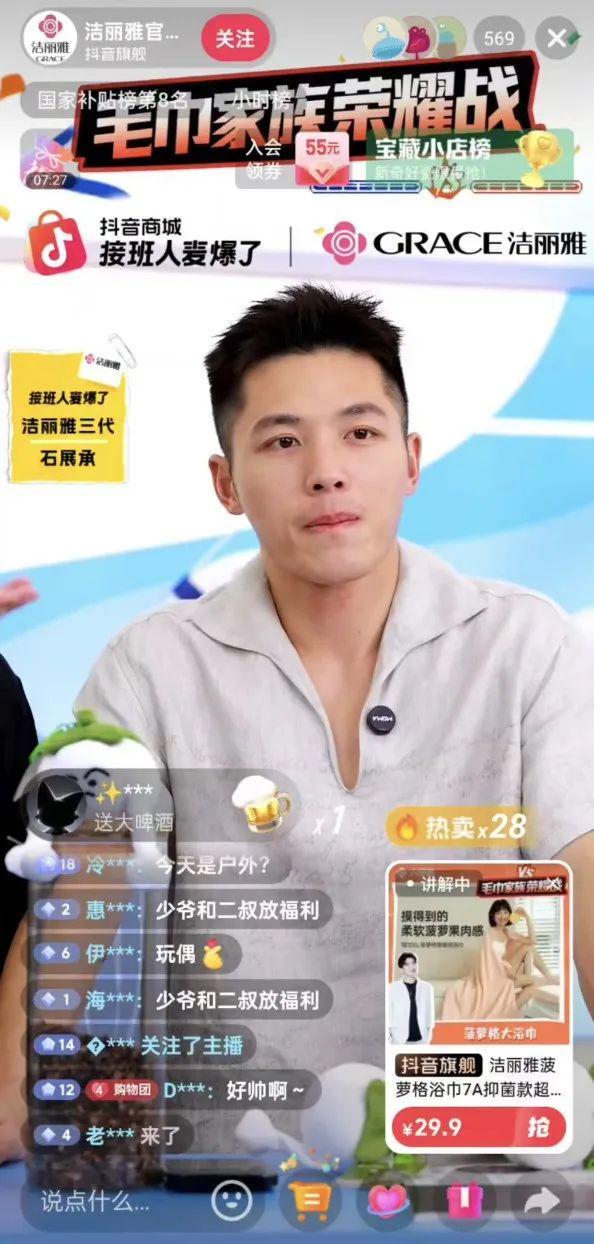 洁丽雅“毛巾少爷”石展承,与“毛巾二叔”石晶合拍的《毛巾帝国》播放量现已超过1.1亿。剧中,石晶的人设是与“毛巾少爷”争夺家产的“反派二叔”,却硬生生靠颜值圈了一波粉,反向为洁丽雅品牌声量添砖加瓦。