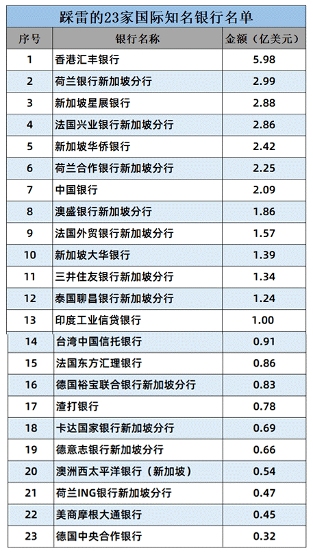 其中,汇丰银行的敞口最大,为6亿美元;新加坡本地的三家银行:星展集团(DBS Group)、华侨银行(OCBC Bank)、大华银行(UOB),敞口共计超6亿美元。