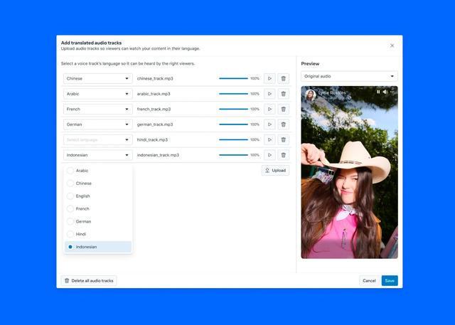 此外,Facebook 创作者最多可以将 20 条配音音轨上传到 Reel,从而扩大英语或西班牙语市场以外的受众群体。这项功能在 Meta Business Suite 的“隐藏式字幕和翻译”部分提供,并且支持在发布前后添加翻译,这与 AI 功能不同。