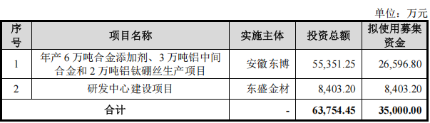 此外,本次上市,东盛金材计划发行股份数量不超过1700 万股,计划募资3.5亿元,用于年产6万吨合金添加剂、3万吨铝中间合金和2万吨铝钛硼丝生产项目及研发中心建设项目,拟投入资金分别为2.66亿元、0.84亿元。