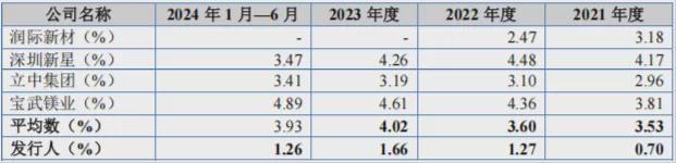 但实际上并非如此。招股书数据显示,2021年至2024上半年,东盛金材的研发费用分别为0.07亿元、0.13亿元、0.11亿元、0.05亿元,研发费用率分别为0.70%、1.27%、1.66%、1.26%,远低于行业3.53%、3.60%、4.02%、9.93%的平均水平。