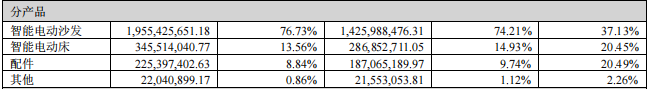 2002年,匠心家居成立于江苏常州,自成立以来公司专注于智能电动沙发、智能电动床及其核心配件的研究与开发。其中,智能电动沙发作为核心业务,占主营业务收入构成的76.73%,智能电动床占比13.56%,配件占比8.84%。
