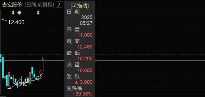 5月27日,吉宏股份在港交所上市,首日公司股价大幅高开超40%,报11港元/股,并一度涨超60%,随后逐渐回落,收盘涨39.06%。