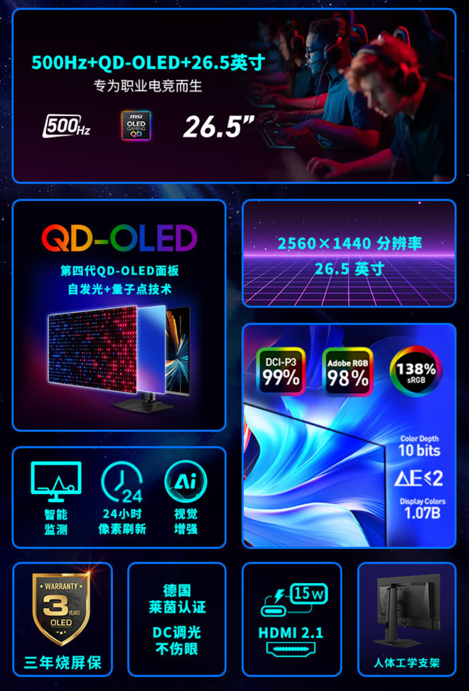 MPG 271QR QD-OLED X50采用了26.5英寸的三星第四代QD-OLED面板,10bit色深,可视角度为178度(水平和垂直),分辨率为2560 x 1440,刷新率为500Hz,响应时间(GtG)为0.03ms,得到了VES ClearMR 21000和DisplayHDR True Black 500认证。该款显示器保证了行业领先的动态清晰度和生动对比度,即使在激烈的游戏中也能呈现逼真的视觉效果。