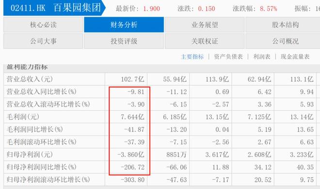 随着美团、京东、拼多多等即时零售电商在生鲜赛道的发力,次日达逐渐发展成小时达,持续挤压百果园这样的传统零售空间,其营收和净利润在近年来被挤压得明显下滑。财报显示,百果园2024年营收102.73亿元,同比下滑9.8%。净利润由2023年的盈利3.62亿元转为2024年的亏损3.86亿元,同比暴跌206.7%,这更是百果园自2001年成立以来罕见的营收负增长。