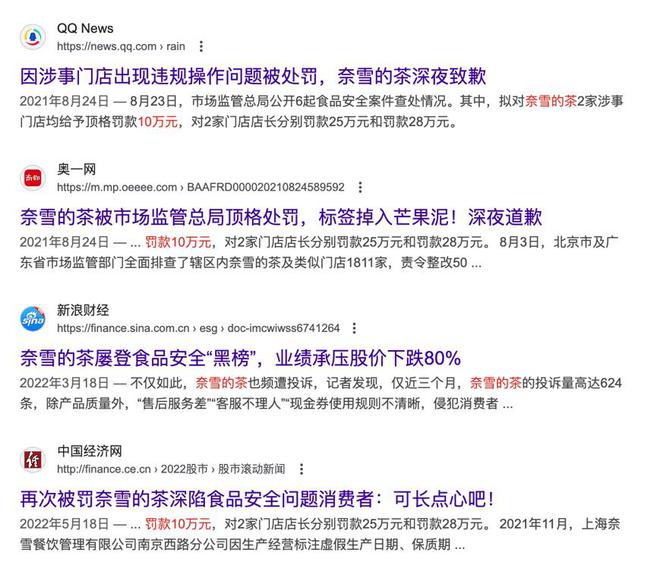据多家媒体报道,2021年8月奈雪北京两家门店被监管部门顶格罚款10万元,店长分别被罚25万元和28万元;同年10月,奈雪上海两家门店又因菌落总数超标、违规标注日期等问题被罚款合计5.5万元。
