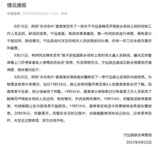 8月21日,有网民及媒体发布“男子发视频称乡政府上班时间大量人员缺岗,曝光后民警夜晚上门吓得家里老人想喝农药自杀”信息,引发网络关注。宁远县迅速成立联合调查组开展调查,具体情况如下: