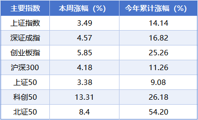 指数层面,本周A股主要指数均大幅上涨。其中,科创50本周累计上涨13.31%,领跑A股各主要指数。此外,北证50、创业板指分别上涨8.4%、5.85%,涨幅也位居前列。本周大幅上涨后,北证50今年累计涨幅已达到54.20%,表现相当抢眼。