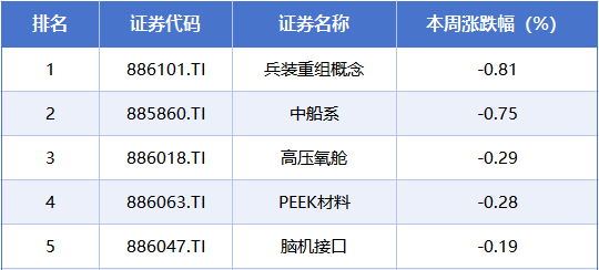 本周排在跌幅榜前排的概念板块分别是兵装重组概念、中船系、高压氧舱、PEEK材料、脑机接口,累计跌幅分别为0.81%、0.75%、0.29%、0.28%、0.19%。