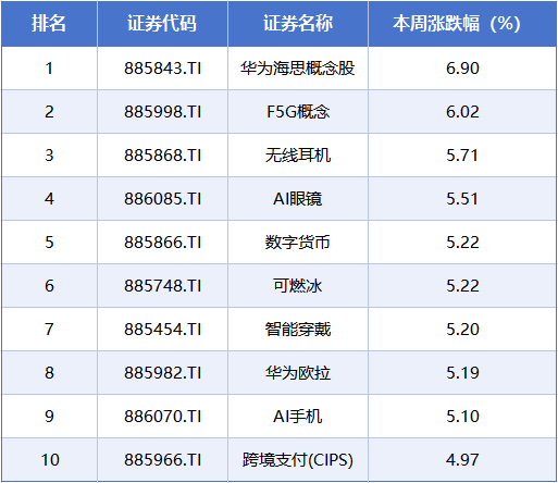 板块方面,本周涨幅居前的概念板块分别是华为海思概念、F5G概念、无线耳机、AI眼镜、数字货币,累计涨幅分别为6.9%、6.02%、5.71%、5.51%、5.22%。