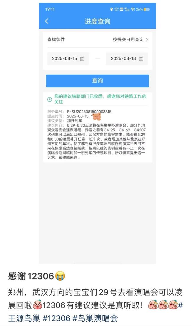 王源鸟巢演唱网友建议加开高铁成功?12306:查询不到加开原因,暑期等客运高峰期会加开车次