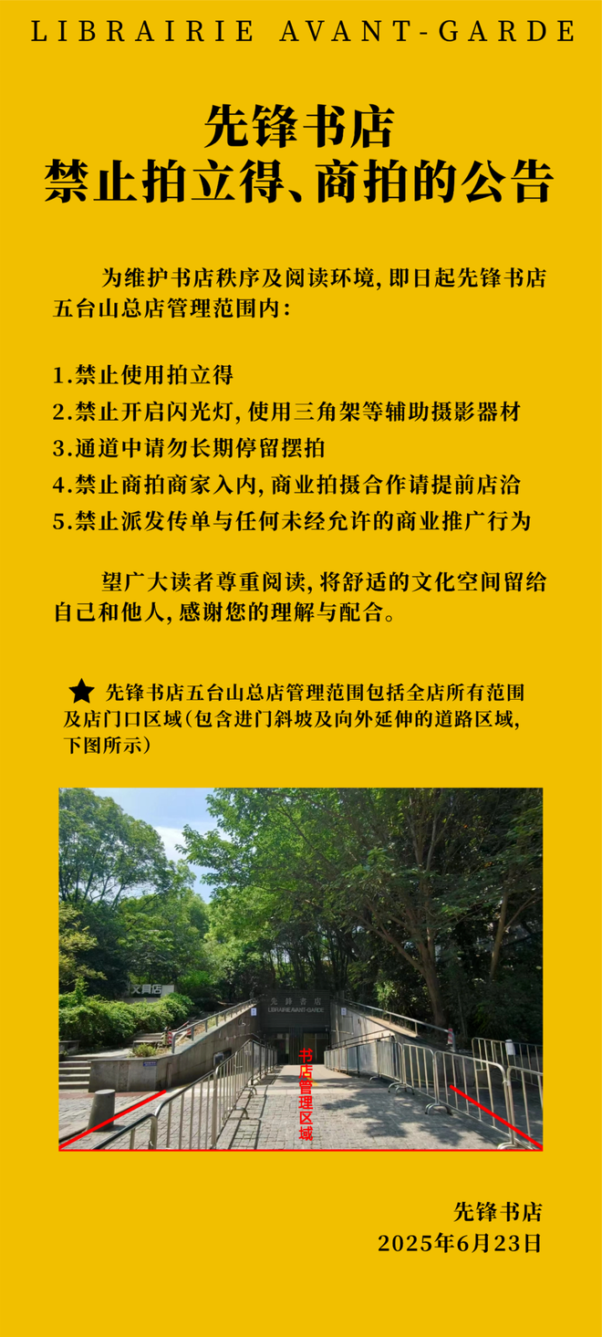 6月23日,先锋书店五台山总店发布“禁止拍立得、商拍”的公告引发广泛关注。该店在公告中明令禁止拍立得等摄影器材入店使用,在店门口设置管理区域防止长时间停留摆拍,并对商拍行为加以规范。