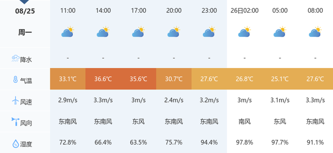 今天是2025年8月25日,随州天气以多云为主,白天微风,夜晚微风,最高气温36℃,最低气温24℃,空气湿度85%,体感温度34.9℃,空气质量优。建议市民午后尽量减少户外活动,避免长时间暴露在高温环境中,注意补充水分,防范中暑。