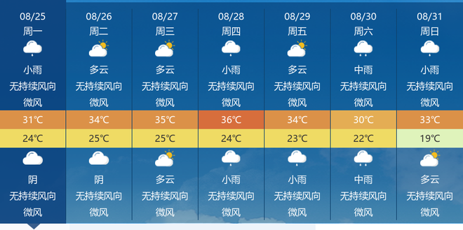 今天是2025年8月25日,十堰白天天气为小雨,夜晚天气为阴,白天微风,夜晚微风,最高气温31℃,最低气温24℃,空气湿度86%,体感温度30.3℃,空气质量优。建议市民外出携带雨具,注意防暑降温,避免午后高温时段长时间户外活动。