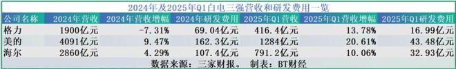 董明珠此前一直强调的技术优势或也面临挑战,而格力在研发投入上并没有重视起来。2024年格力研发费用为69.04亿元,同期美的的研发投入为162.3亿元,海尔的研发投入为107.4亿元,分别落后美的和海尔93.26亿元和38.36亿元。2025年一季度,格力研发费用为16.99亿元,同期美的和海尔的研发费用为43.48亿元和32.93亿元。在这个产品质量和技术才是硬道理的时代,消费者已经不再盲目追崇所谓的个人IP。