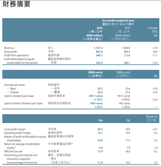 先来看利郎,这个曾在中国男装界响当当的品牌,今年上半年的表现有亮点也有隐忧。集团整体营收同比增长了 7.9%,达到 17.3 亿元,毛利率稳稳保持在 50.2%,股东应占利润也有 2.43 亿元,看着还挺不错。