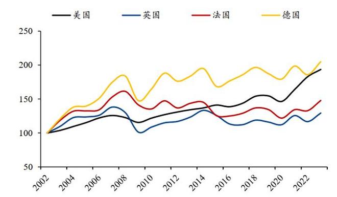 从国际贸易理论的来说,最直观体现国家间的制造业能力差异的就是贸易逆差。而美国这个数字仍在持续扩大,2023年贸易逆差达到创纪录的1.1万亿美元,相较于20年前翻倍。