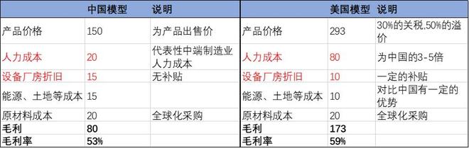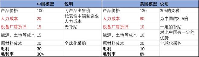 最后是产品在美国的售价,由于有关税的存在,假设最终企业拿到的价格,美国企业比中国高出30%,其他成本项用上述条件,我们建立中端制造业的模型: