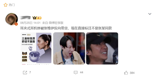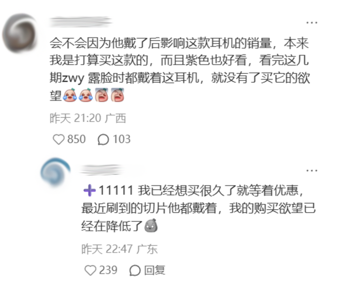 一些跟张维伊疑似撞款的网友更是破防,表示本来戴得好好的,现在都不想戴了。想买类似款耳机的网友也没招儿了,本来想买的,现在不想了。