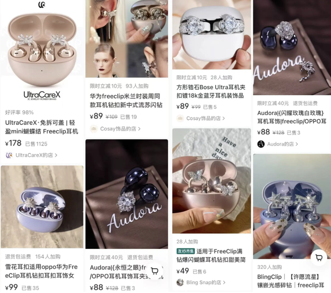 登上时装周前,FreeClip就已经是配饰品牌的香饽饽。3C珠宝品牌UltraCareX为其量身定制的金蛇款、银蛇款、蝴蝶结款、爆闪大钻款耳机钻扣,在小红书等社交平台上热度相当高。除了FreeClip,OPPO、Bose的耳夹耳机,同样是3C珠宝的重点攻略对象。