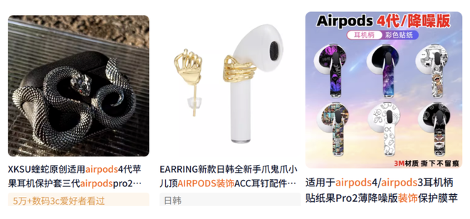 一晃快10年,“蓝牙耳机美学”已经不止是科技感。虽然苹果官方坚持极简设计,但装饰AirPods在民间匠人的手里已成小商品大点兵,从贴纸到浮雕,只有你想不到,没有义乌做不到。