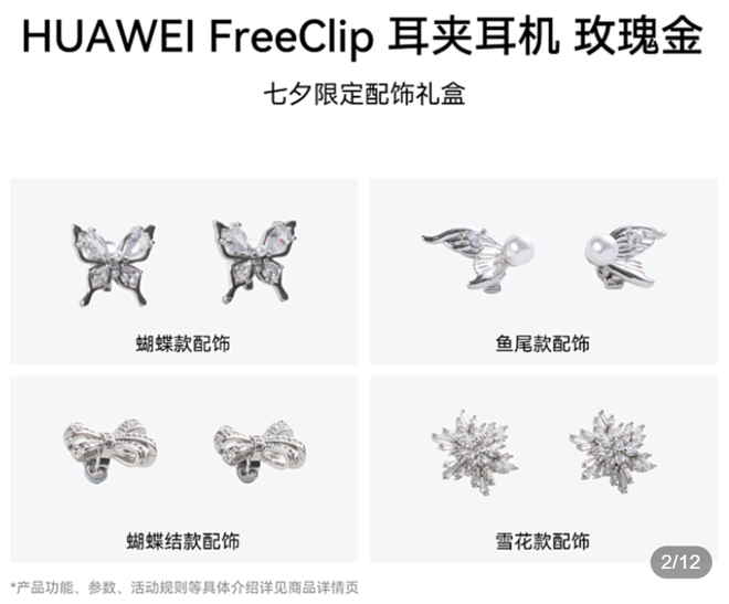 临近七夕,华为官方商城售价1079元的FreeClip限定礼盒里,就包含了四款配饰。