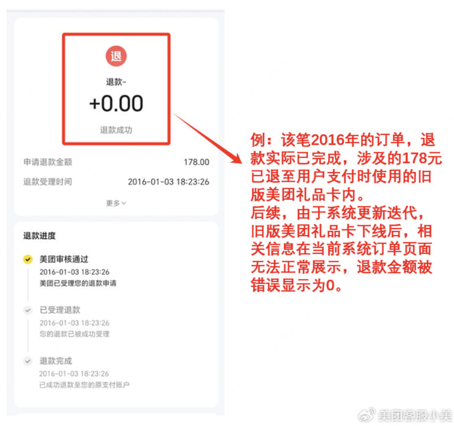 美团在解释退款疑惑时也提到了“系统的问题”,可能导致页面显示错误,也可能导致钱的流向多变。
