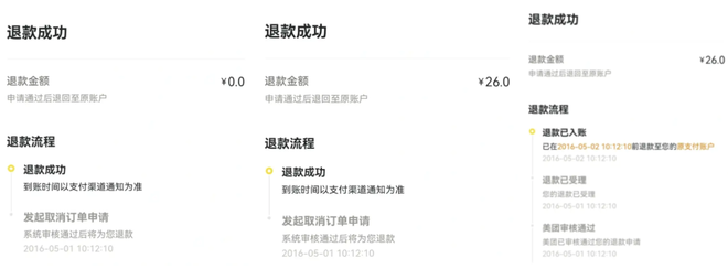 更让网友们感到“后背发凉”的,是随着争议升级,美团在周日白天悄无声息地修改了退款进度和退款金额(也就是网友口中的“篡改数据”“一查询就退款”)。虽然官方在深夜回应,这是因为产品进行了修复,是为了给用户显示正常退款结果。