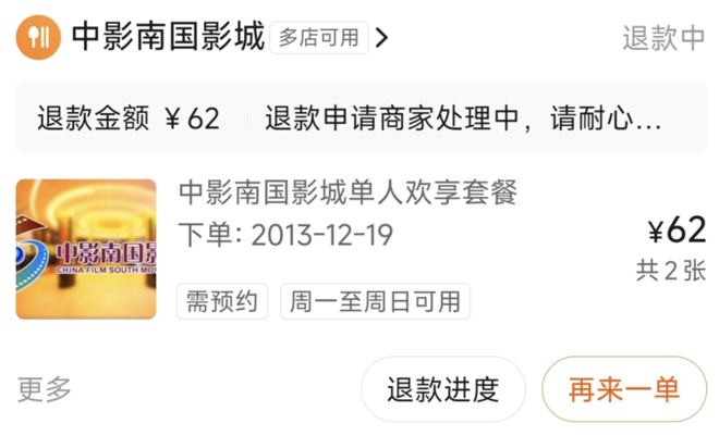 而被命运抽中的洪欣则在“退款失败”和“退款中”来回徘徊。她在2013年曾在美团花19元买过一单KTV券,直到2年后才想起了这件事,在2015年提交了退款申请,但直到2022年才迎来结果,退款失败。