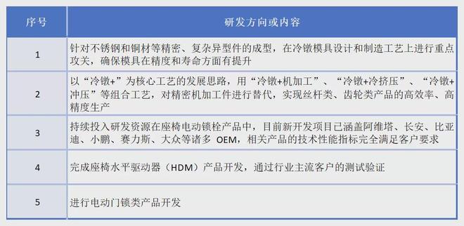 再比如,在锁具新品推广上,2024年公司推出新的电动锁栓产品,用于汽车后排座椅靠背角度的电动调节,2025年已经在小鹏、阿维塔、东风等品牌的车型上量产,赛力斯、大众、比亚迪等品牌的相关车型上的开发进展顺利,并将在下半年陆续进行量产,将为锁具业务带来新的业务增量。
