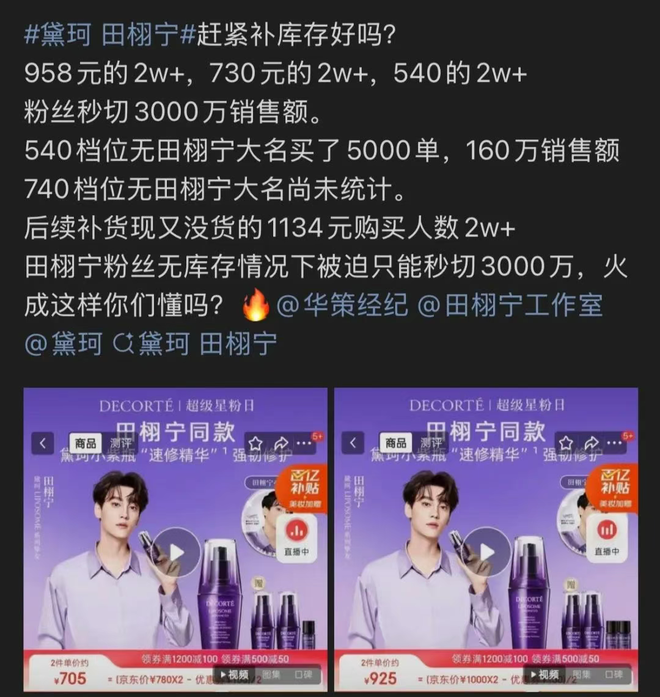 展示实力的时间在8月20日晚上9点19分,或许为了鼓动“柠檬水”(粉丝群体名称)的士气,黛珂把开卖时间选在了田栩宁的生日(9月19日)。很难说清所有售卖链接是不是都做到了秒切,但“剁椒Spicy”指出,多款规格的LIPOSOME系列小紫瓶精华10分钟内全线售罄。