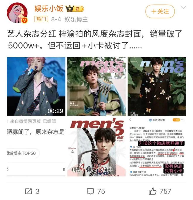 无论是护肤品还是食物,粉丝好歹可以转手找路人买单。但有一种被叫做“流量标的物”,粉丝只能纯砸钱,那就是封面杂志。体积大、运费高、纯粉丝向,就算你免费送路人,路人都觉得占地方。