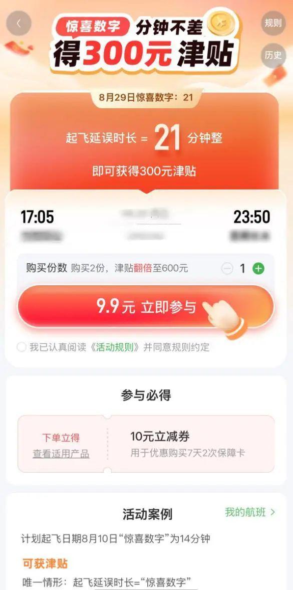 据界面新闻报道,近期,航旅纵横推出了一款9.9元的 “惊喜数字” 精准延误险,引发不少消费者吐槽。该产品因理赔条件苛刻,被指误导消费者,甚至有消费者认为其“赔付概率几乎为零,类似竞猜游戏”。